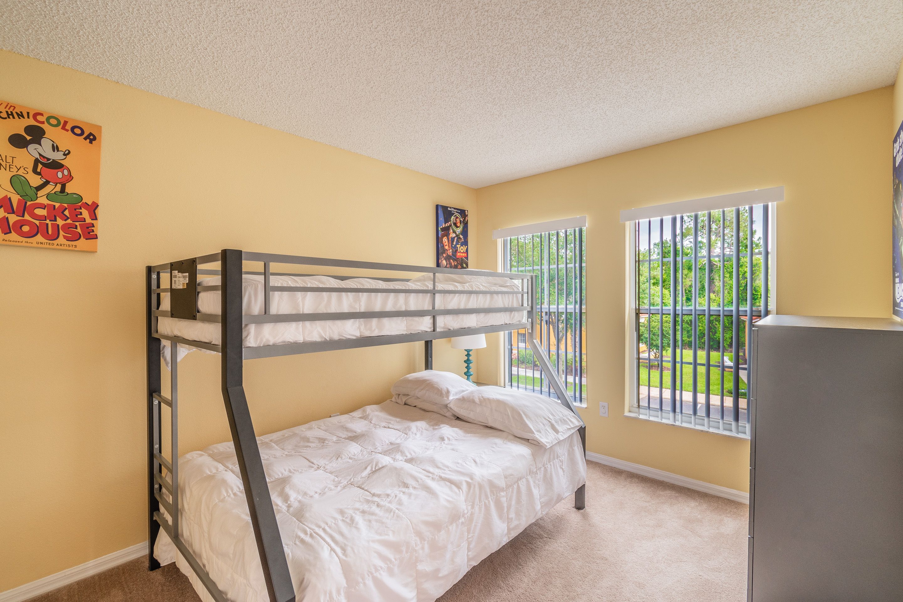 The fourth bedroom is furnished with one bunk bed, double on the bottom, single on the top, nightstand with lamp, a chest, and clock radio. It has its own closet space and an adjacent, shared family bathroom. All bedding, bed sheets and pillows are provided.