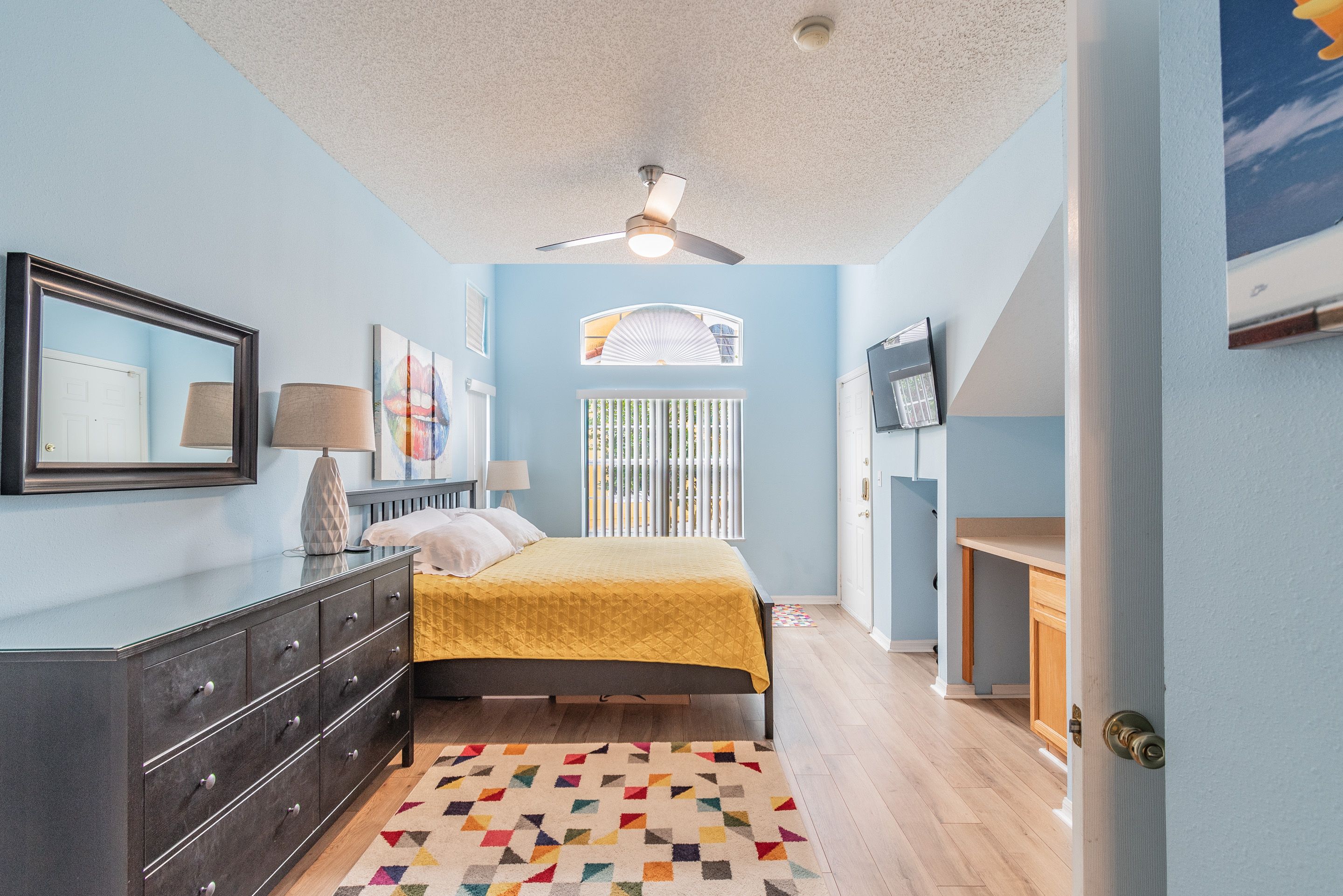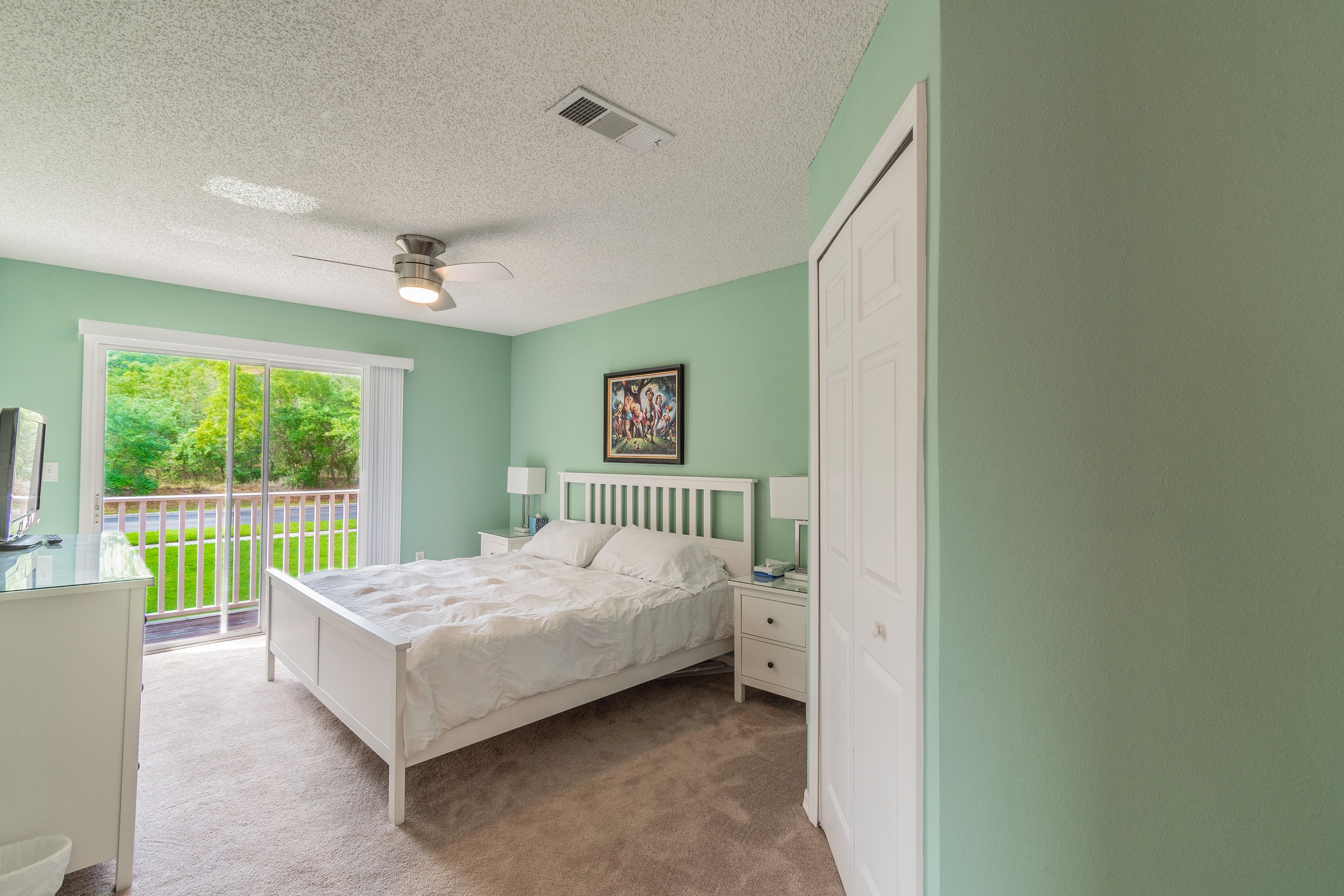 The second master suite is furnished with a King bed, nightstand with lamp, dresser with mirror, clock radio and a flat screen TV. It has its own closet space and a private bathroom. All bedding, bed sheets and pillows are provided. The master bedroom also has its own private balcony.