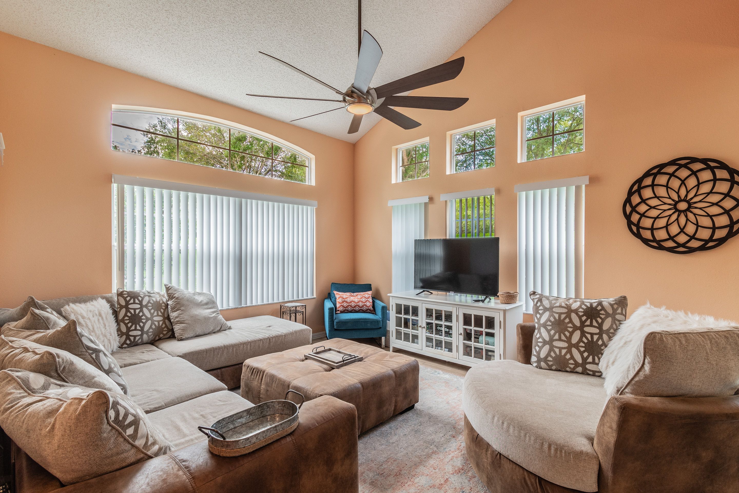 Living Room of our villa is spacious, with a two comfortable sofas, chair, coffee table, and two end tables with lamps, 50″ flat screen TV, DVD player, . This living room leads to a cozy patio area.