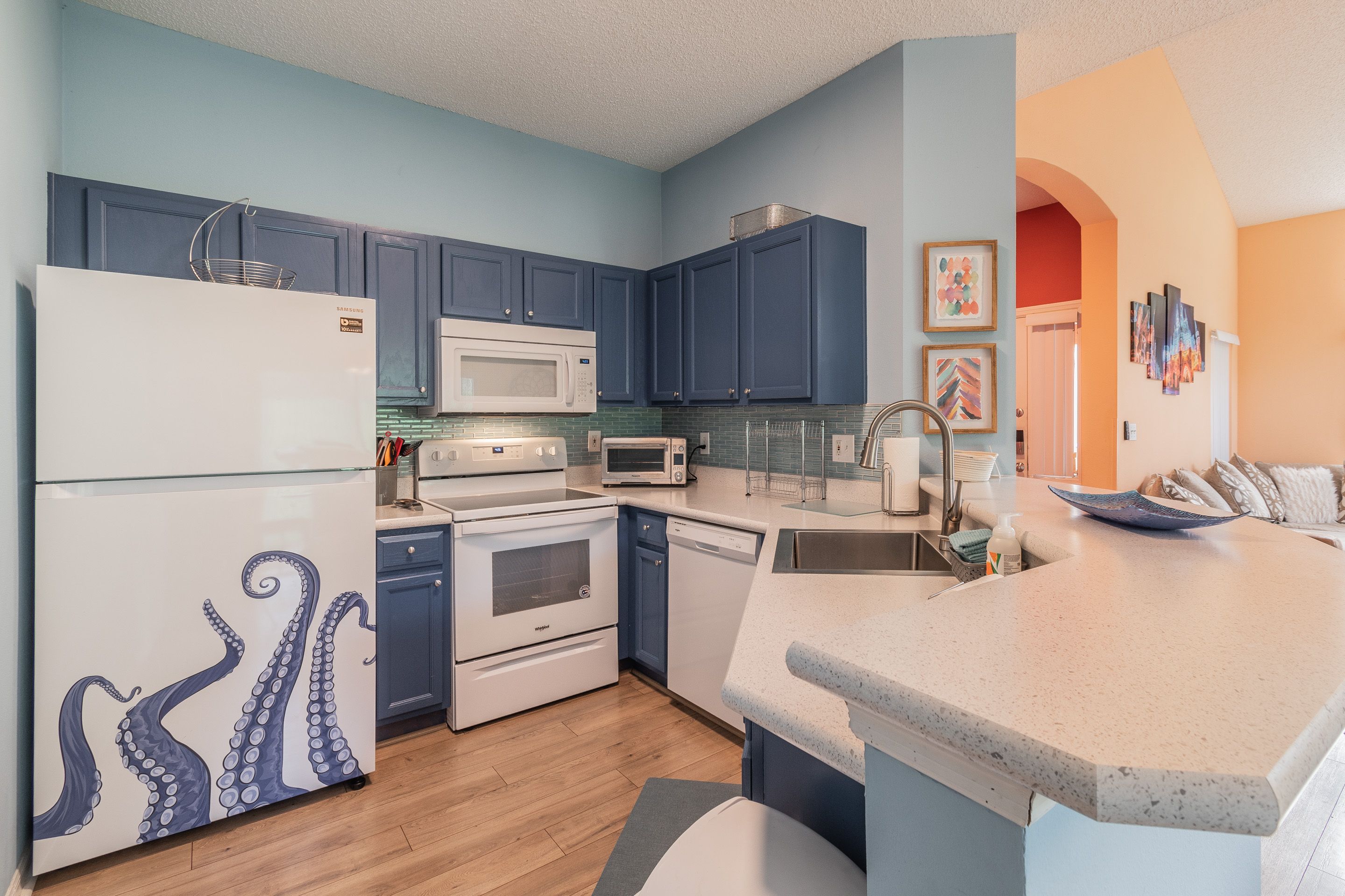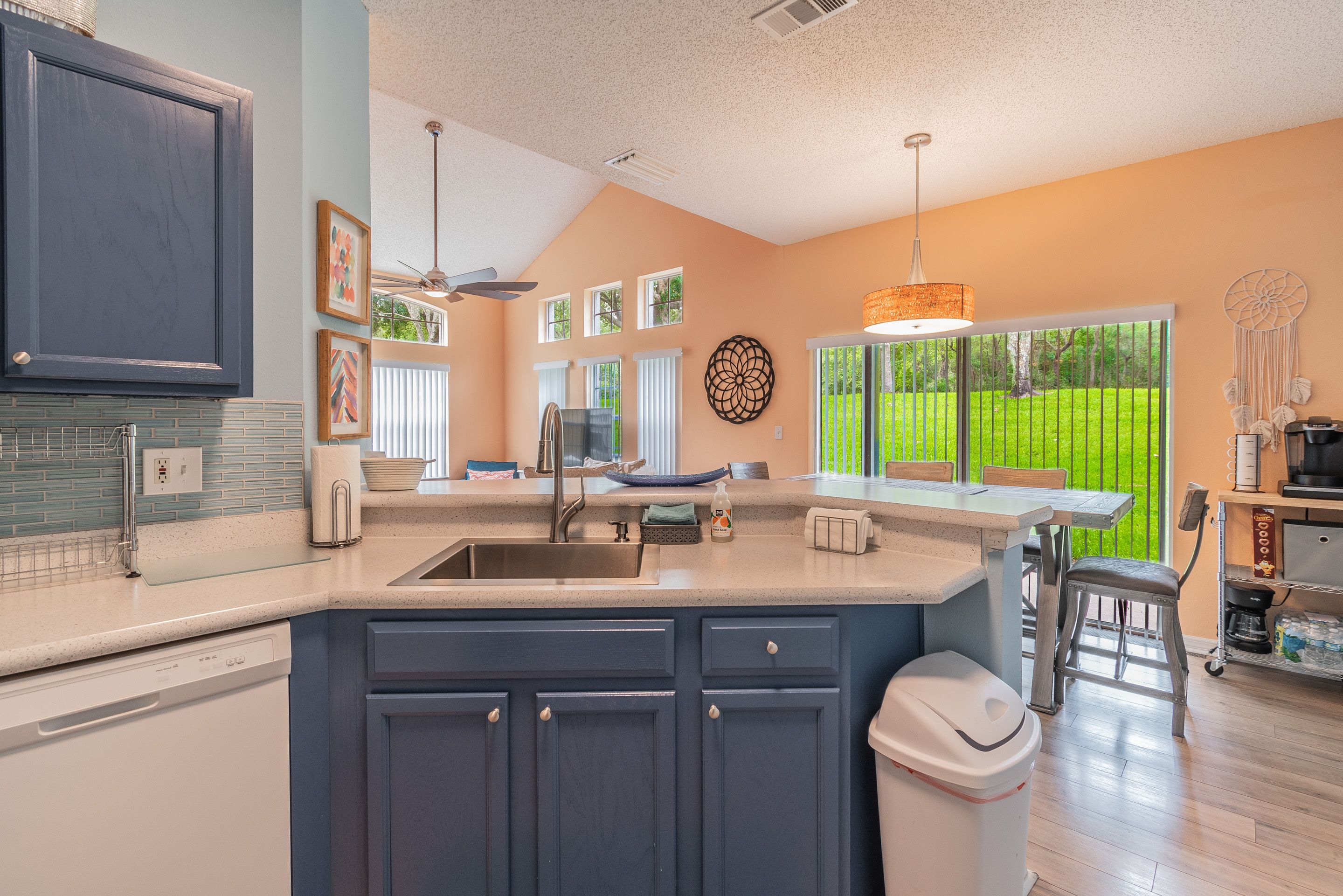 Our villa has a well-equipped kitchen that makes food preparation a breeze while you are on vacation. To start off, this kitchen has an oven and a cook-top stove to make special meals of your choice and is complemented by a refrigerator with freezer, microwave oven and automatic icemaker. This kitchen is “complete” with dinnerware, silverware and glassware settings, kitchen towels and oven mitts, knives and cutting board. It also offers various kitchen utensils including corkscrew and grater, Salt and pepper shakers. There are plenty of pots and pans, baking sheets, microwaveable dishes.